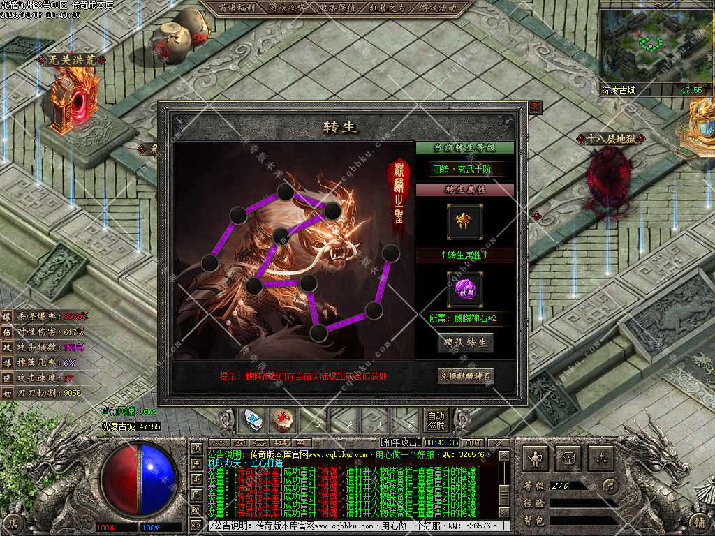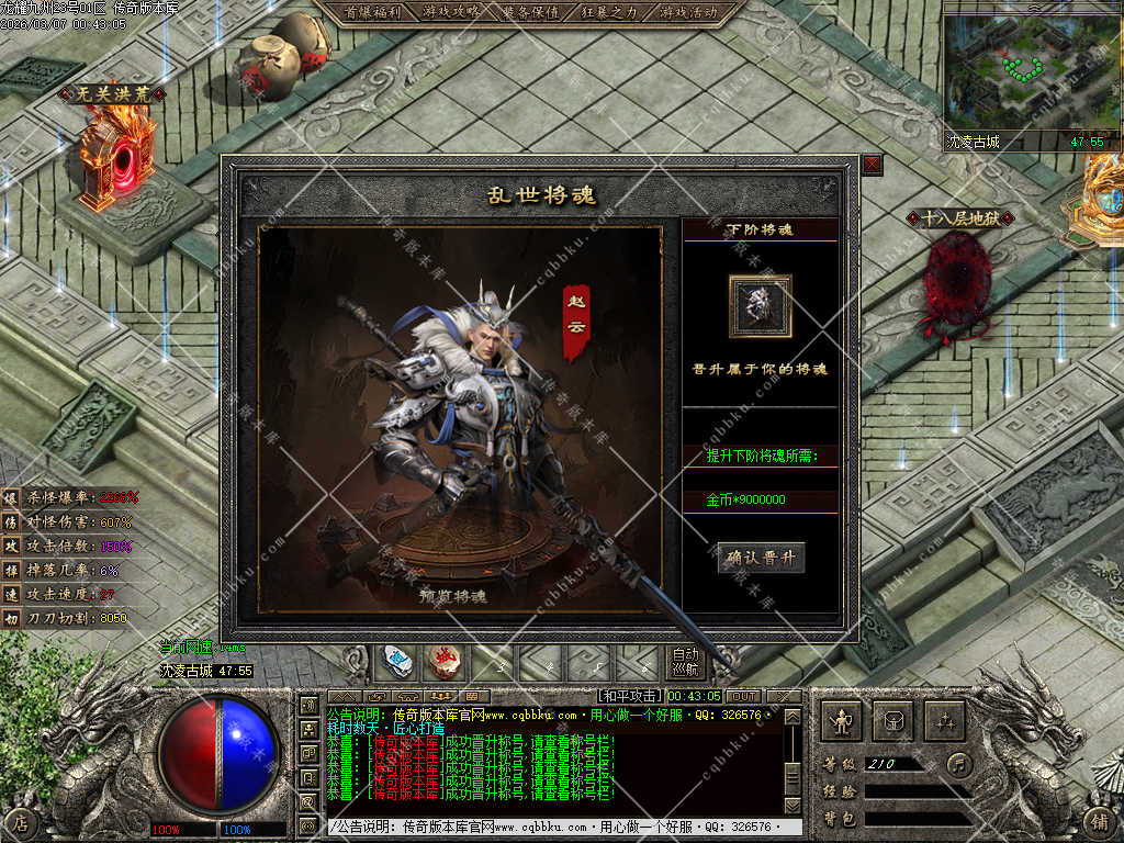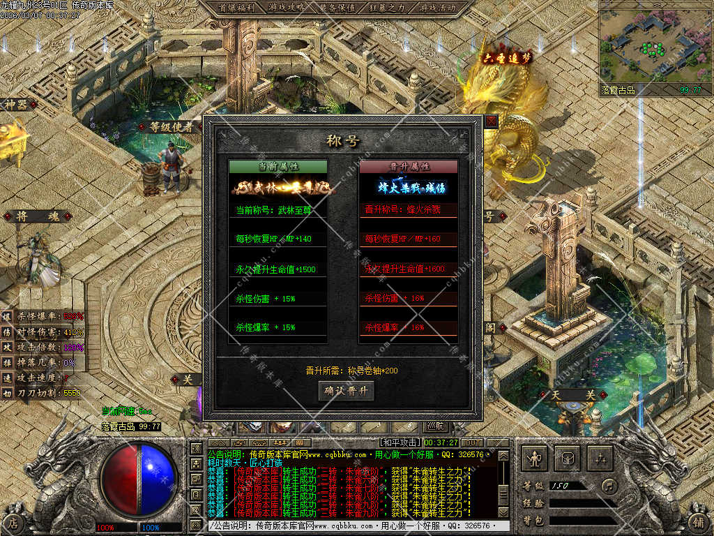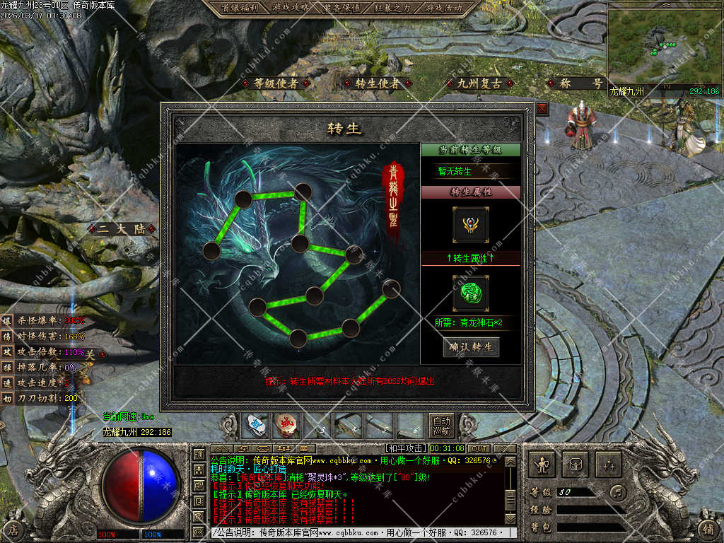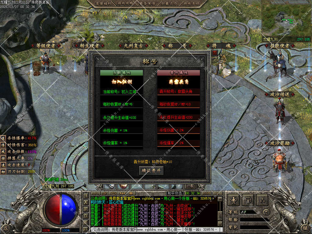 3.在以上基础充值326元宝开通满级九州古武 获得全服唯一传送属性附带攻速,