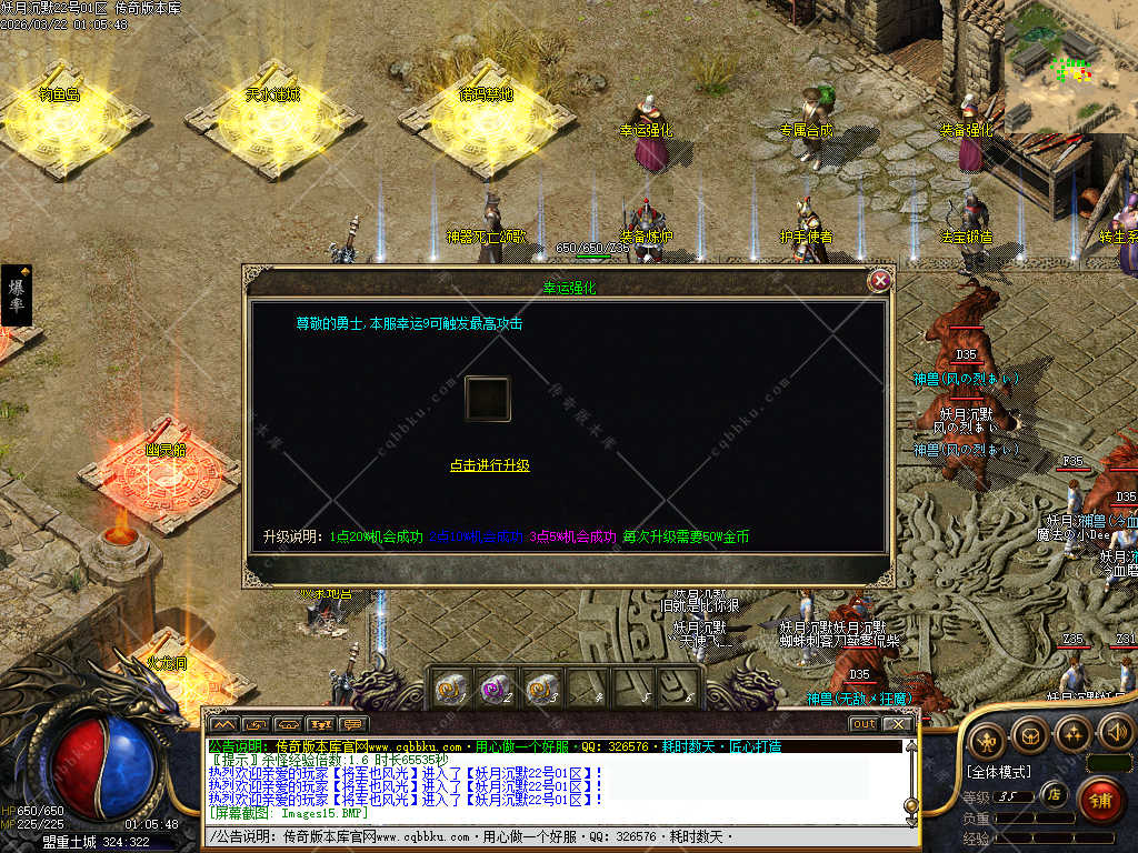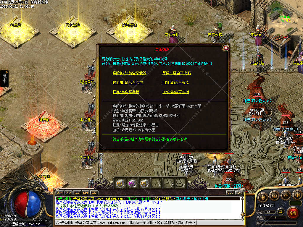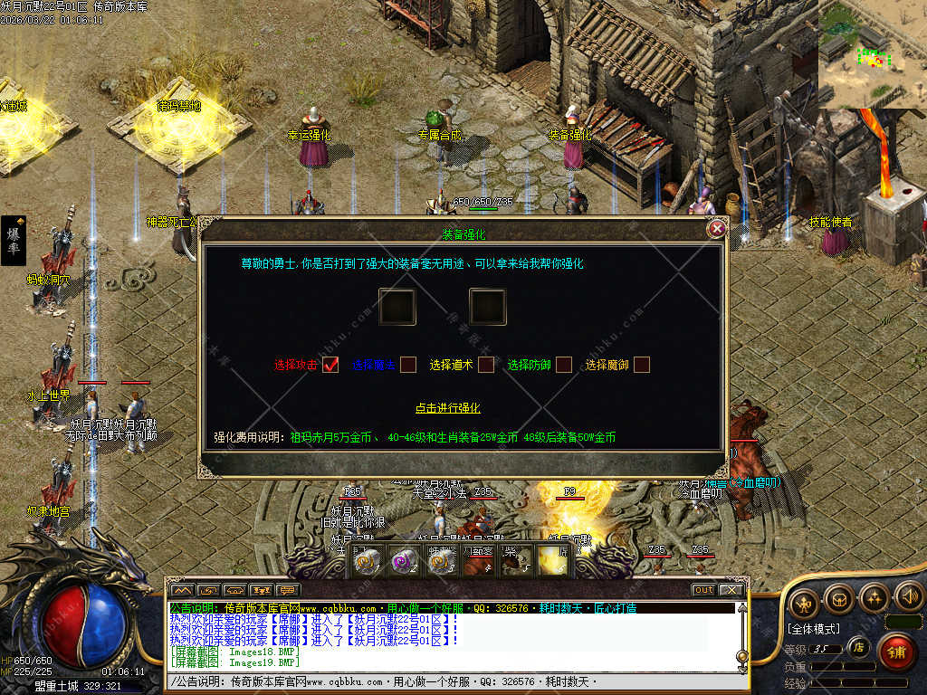 祖玛赤月装备很好出,当你下图觉得吃力的时候,可以去土城找强化NPC. 同样的装备可以进行强化,最高强化到5重,前期装备强化相当于白送,非常便宜。也是增加实力的一环。