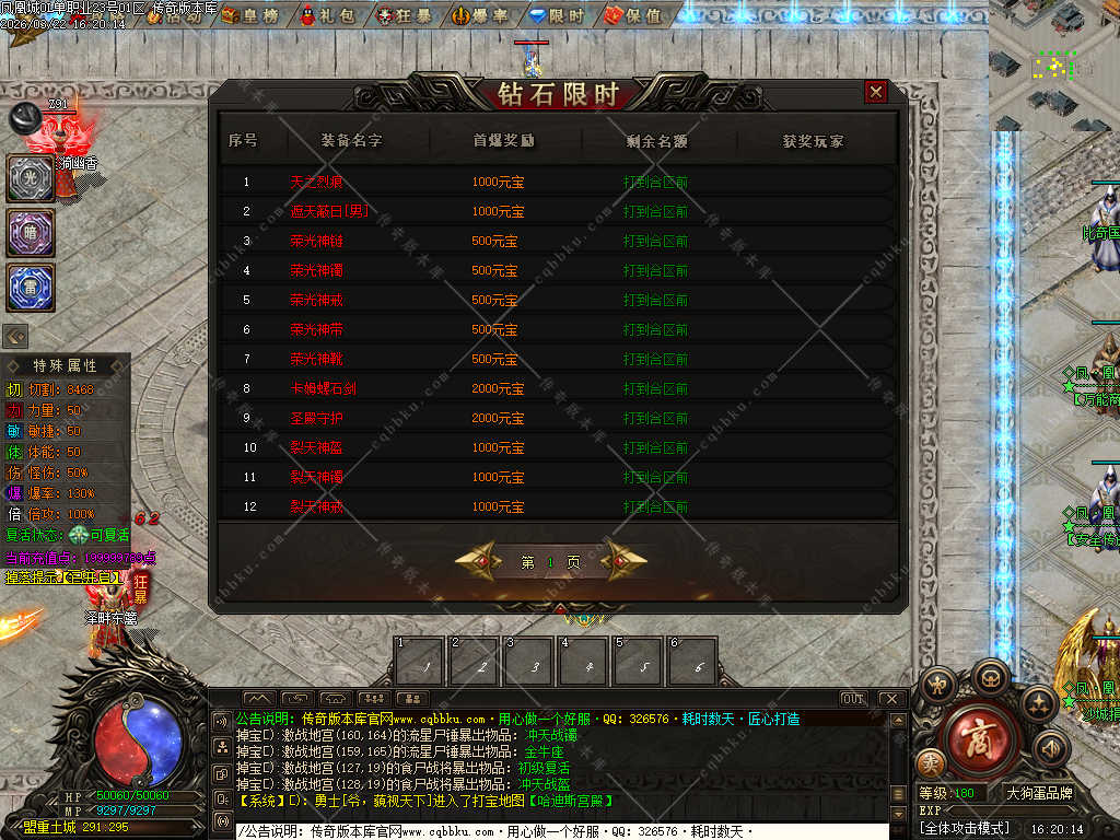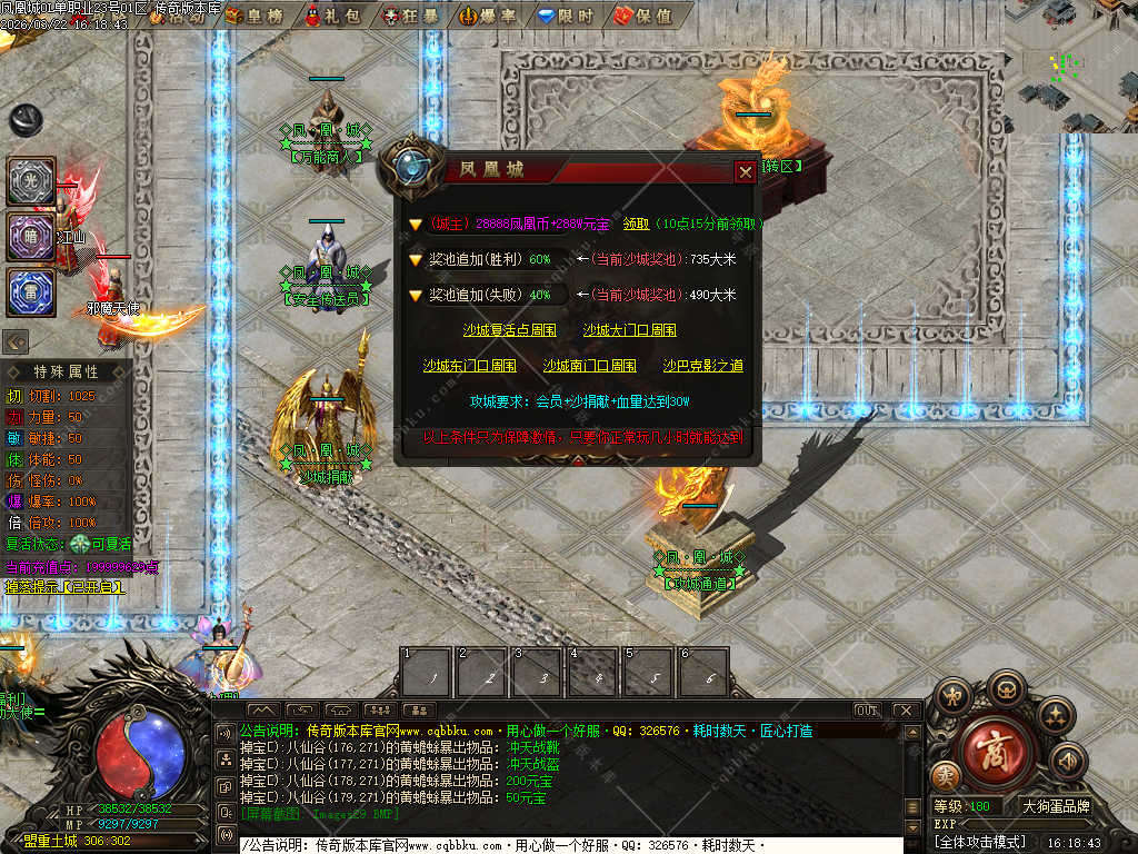 【攻沙介绍】: 开区第2天中午合区,晚上8点攻城,奖励游戏中自行查看.