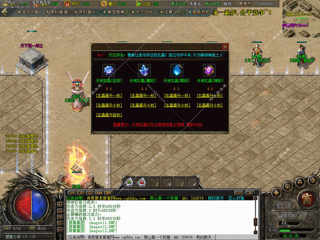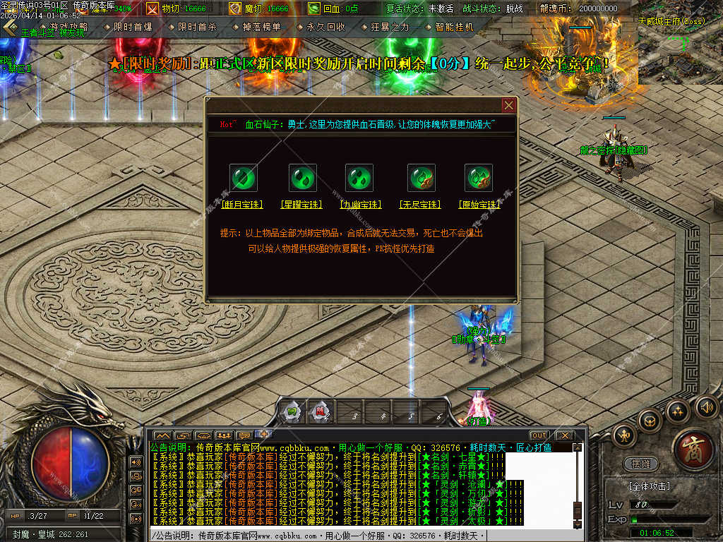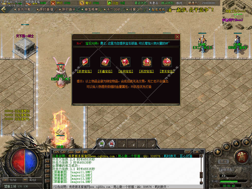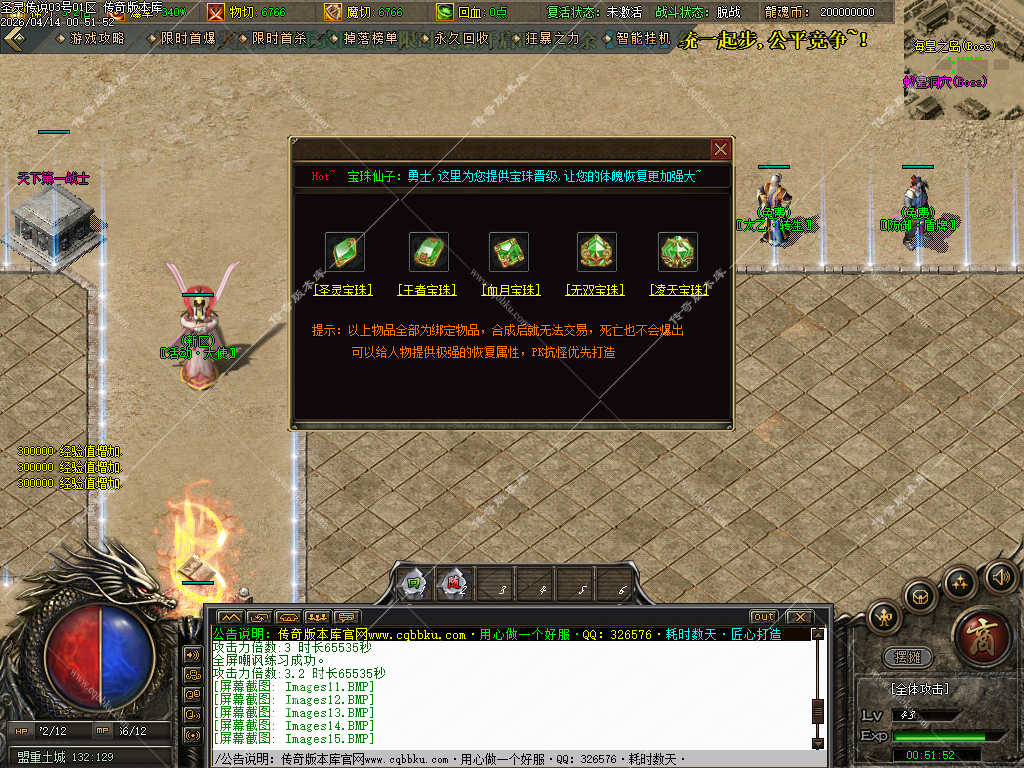 前期在新手打宝地图刷怪攒材料、元宝,所有装备全靠打,可自由交易保值。