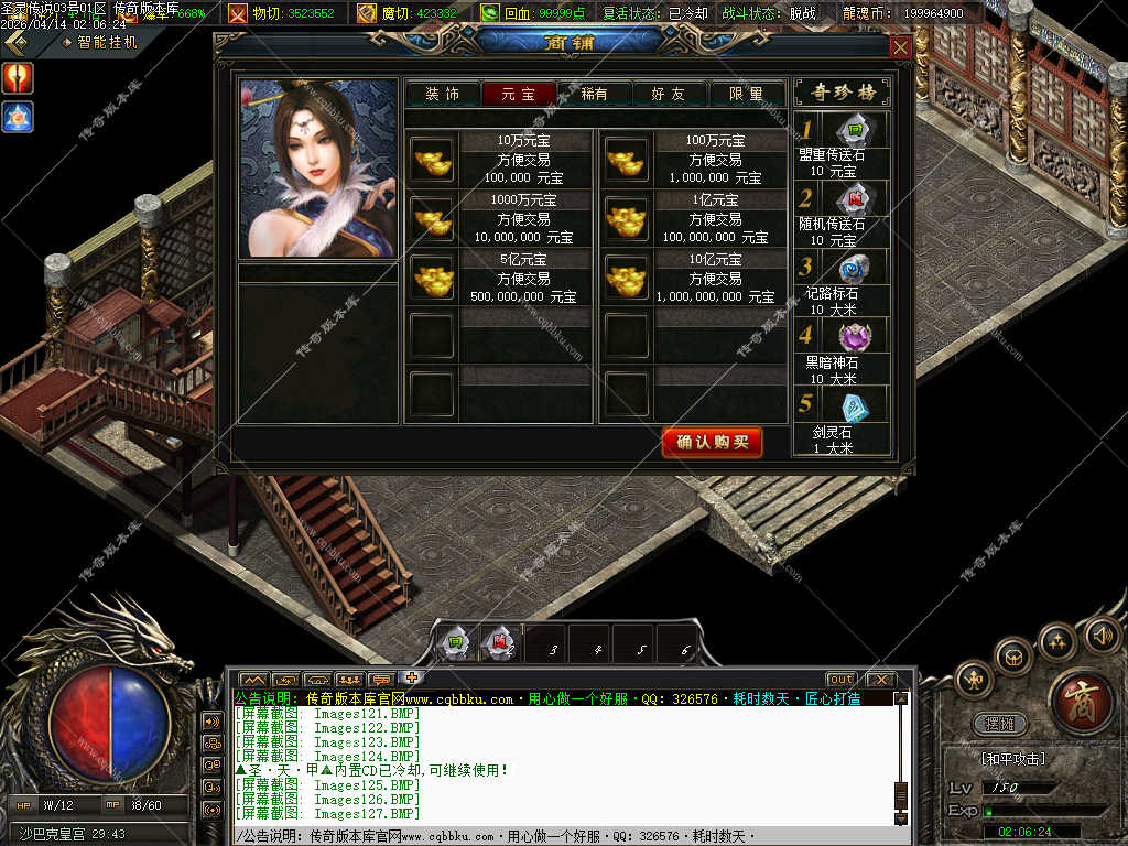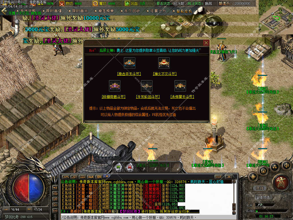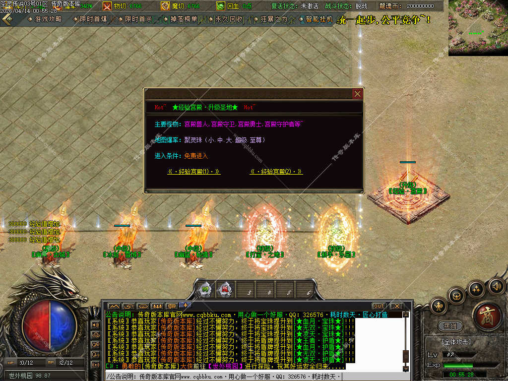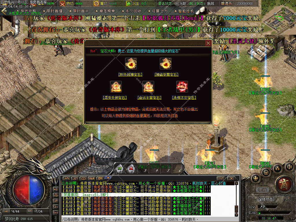 前期在新手打宝地图刷怪攒材料、元宝,所有装备全靠打,可自由交易保值。