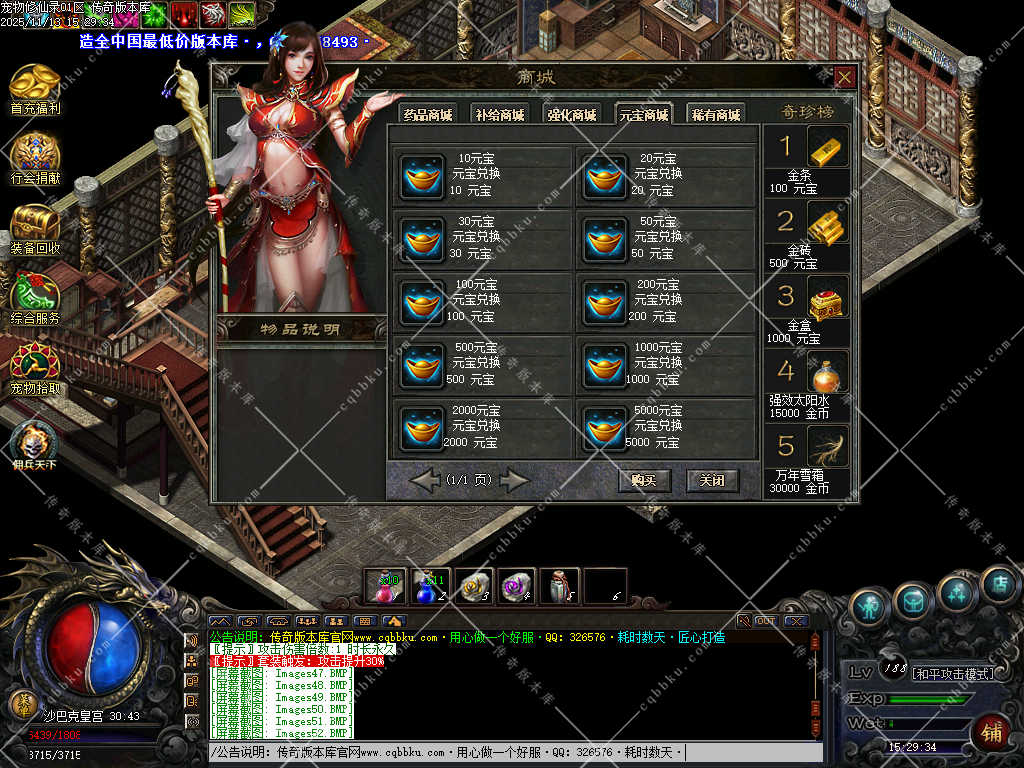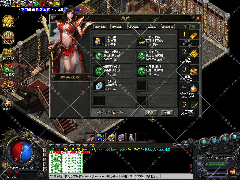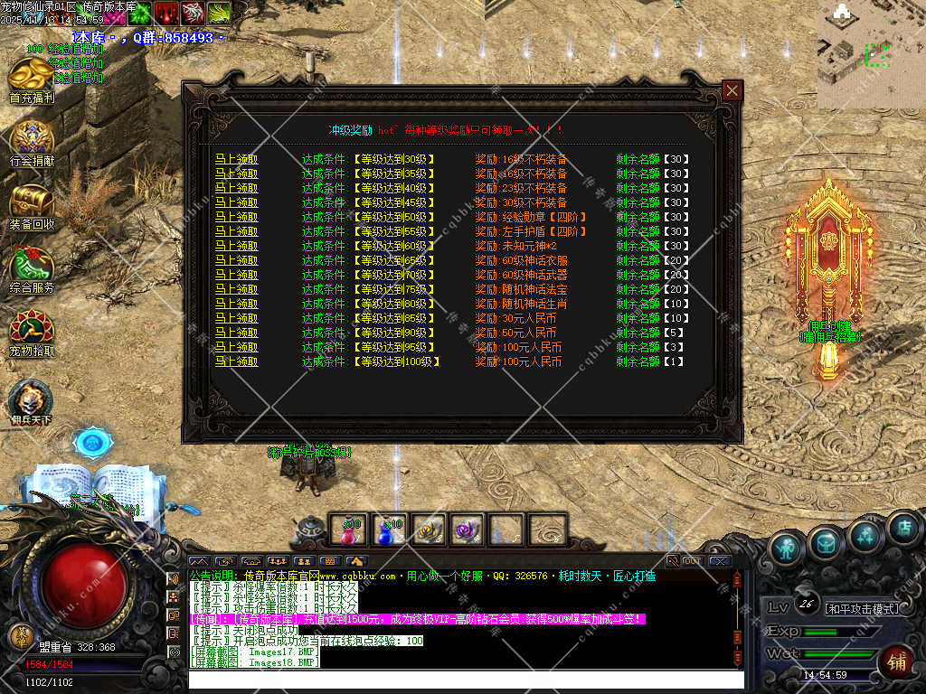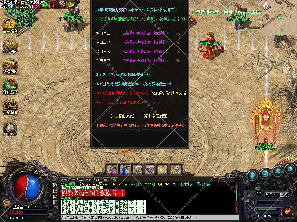 30元沙捐会有专属地图,长期玩家必备,里面刷30-99级的BOSS,只刷BOSS,高经验每个怪100W经验至2500W经验不等(主要看怪等级) 杀怪数量够了自动无条件转生
