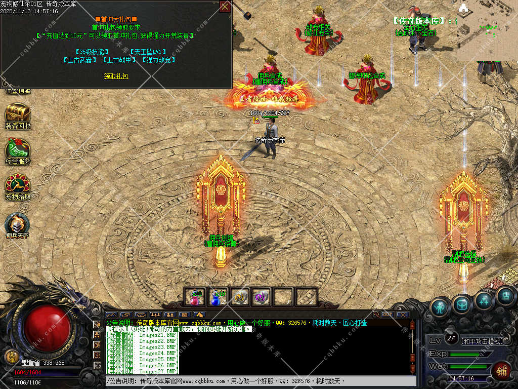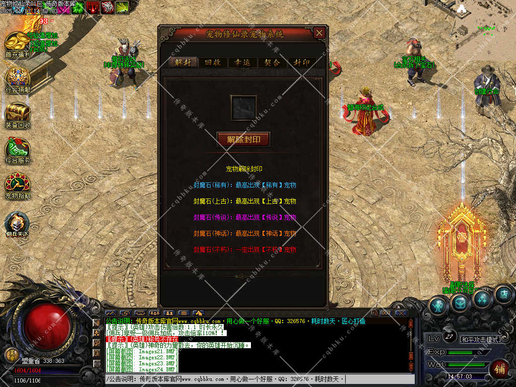 同时沙捐会送2个未知元神+和解封石(神话)可开25-85级宝宝,新手必备从此不再低声下气求人施舍,带着宝宝开始你的逆袭之路,(高级BOSS能秒人多注意 )