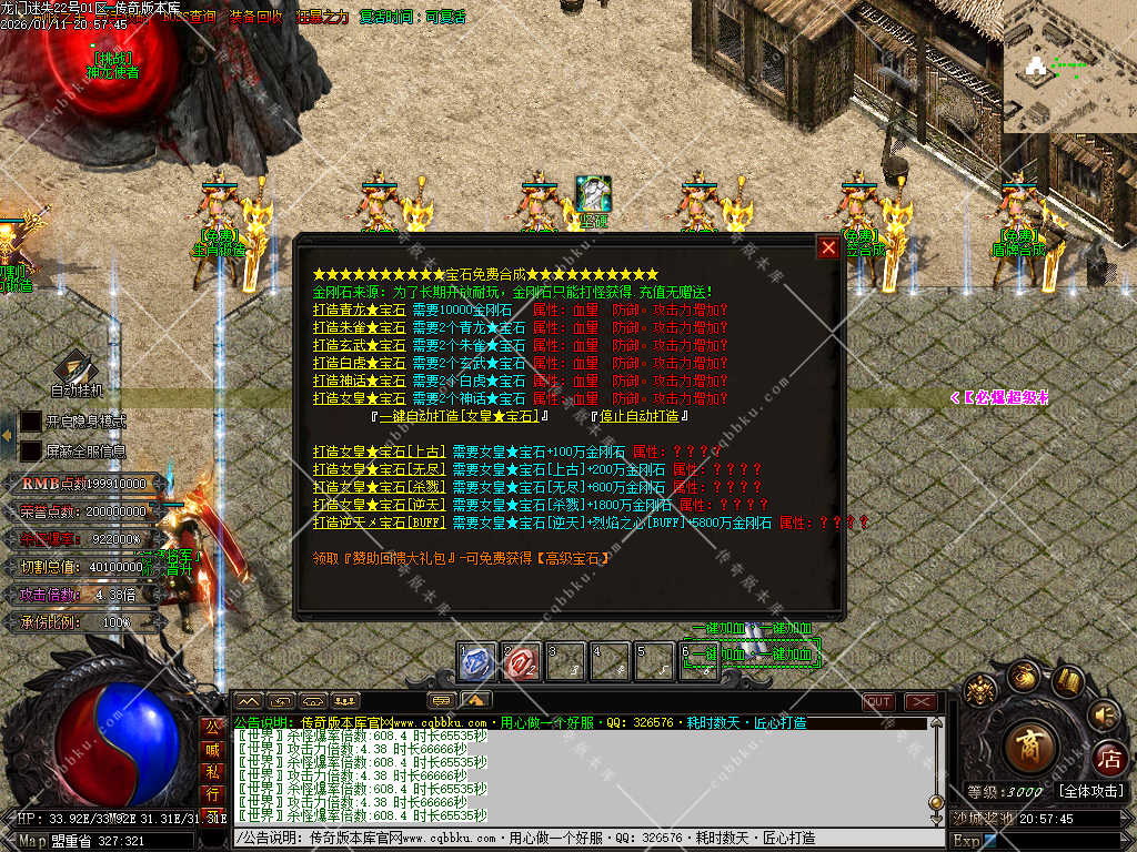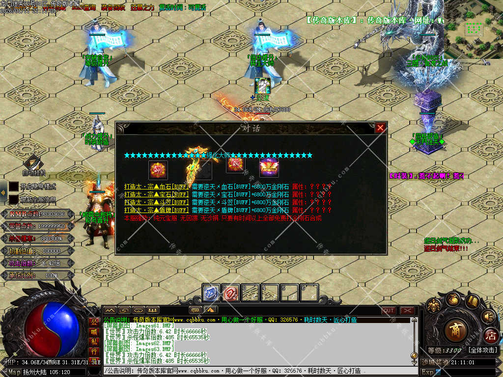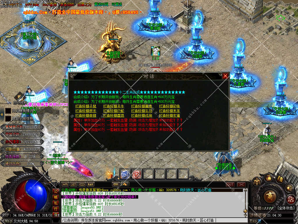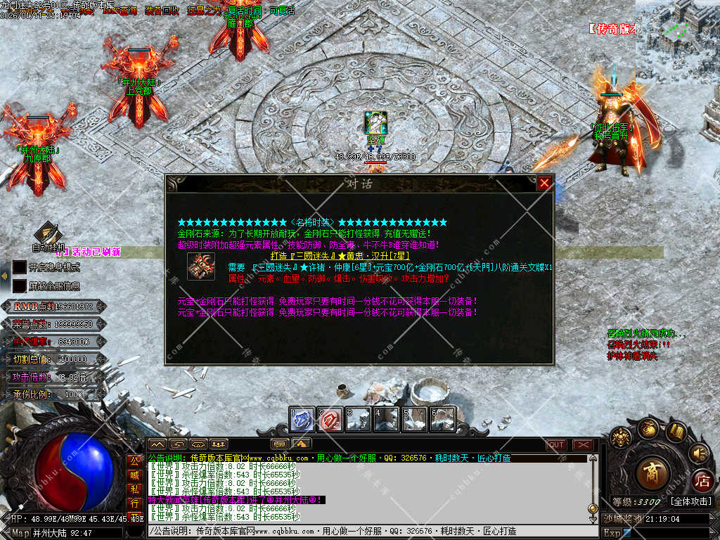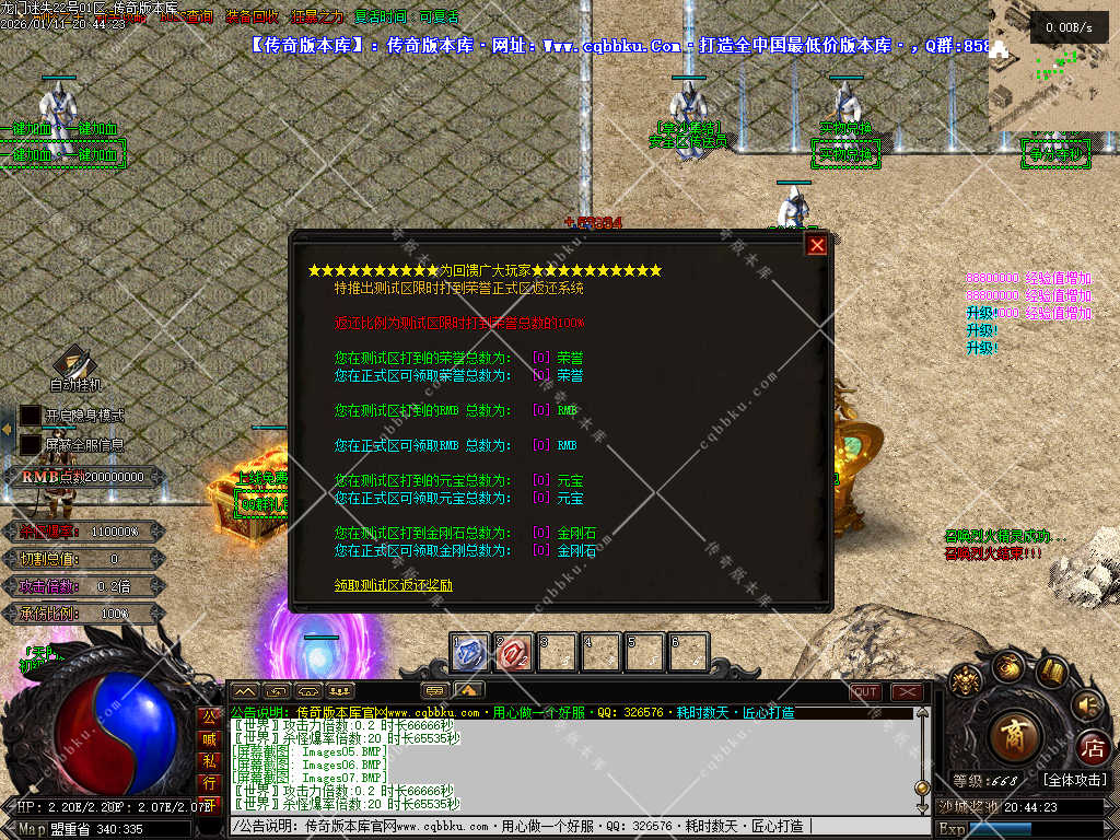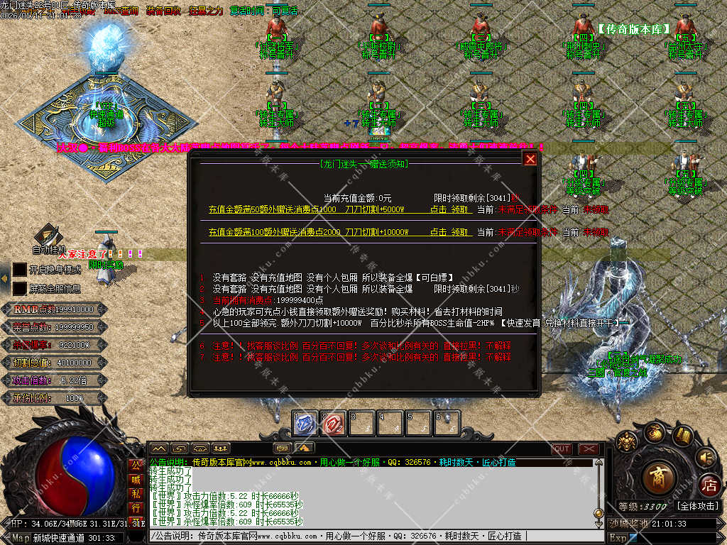 散人线路1:上线输入QQ群礼包码领取初级特殊!!!散人线路2:上线有赠送元宝金刚石盟重左上角特殊合成!!【本服元宝金刚石狂暴活动怪爆100亿以上】!