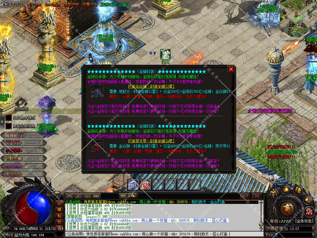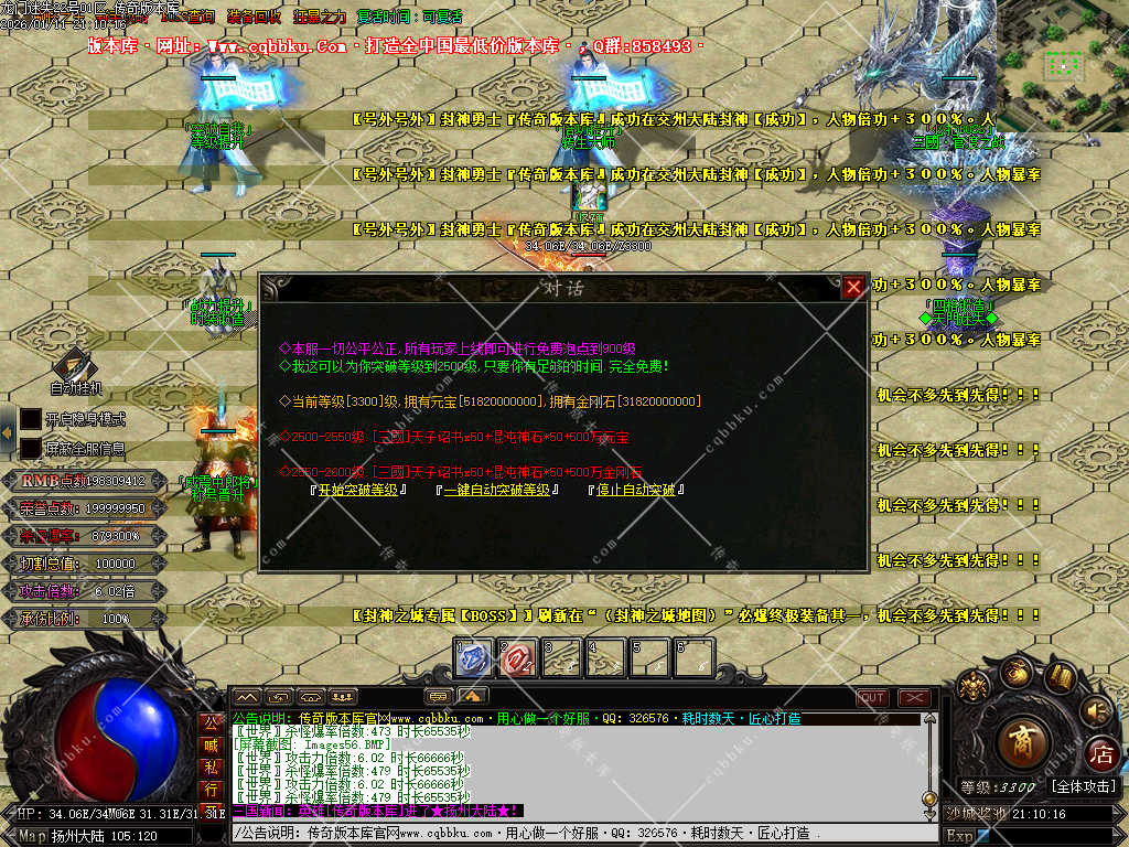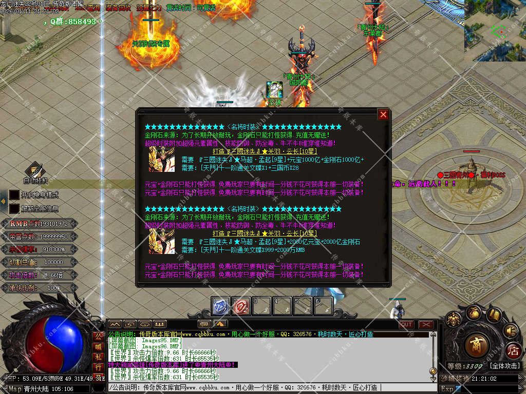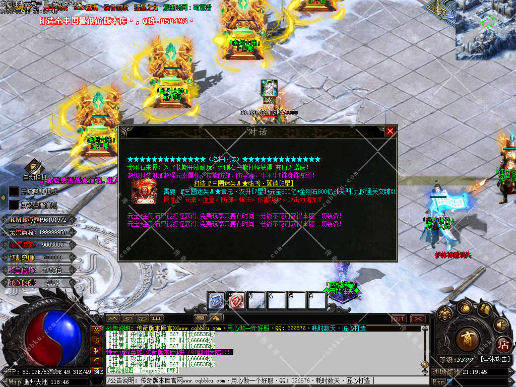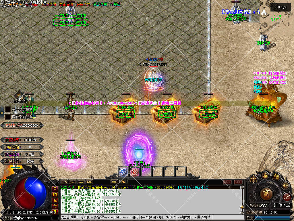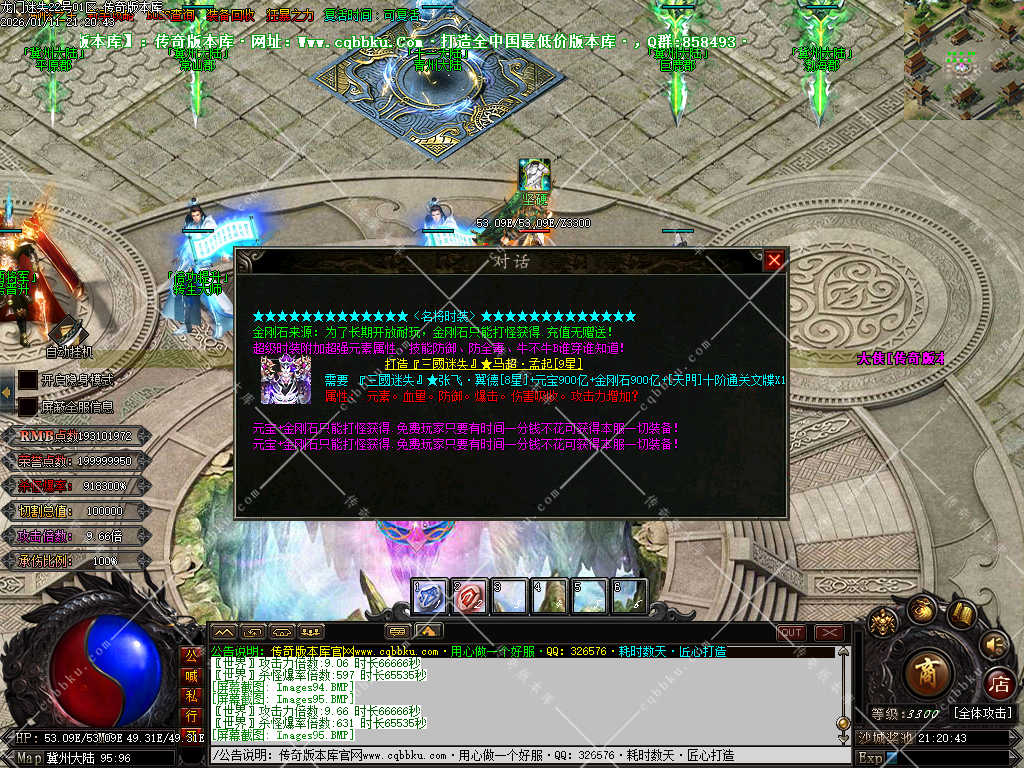 散人线路1:上线输入QQ群礼包码领取初级特殊!!!散人线路2:上线有赠送元宝金刚石盟重左上角特殊合成!!【本服元宝金刚石狂暴活动怪爆100亿以上】!