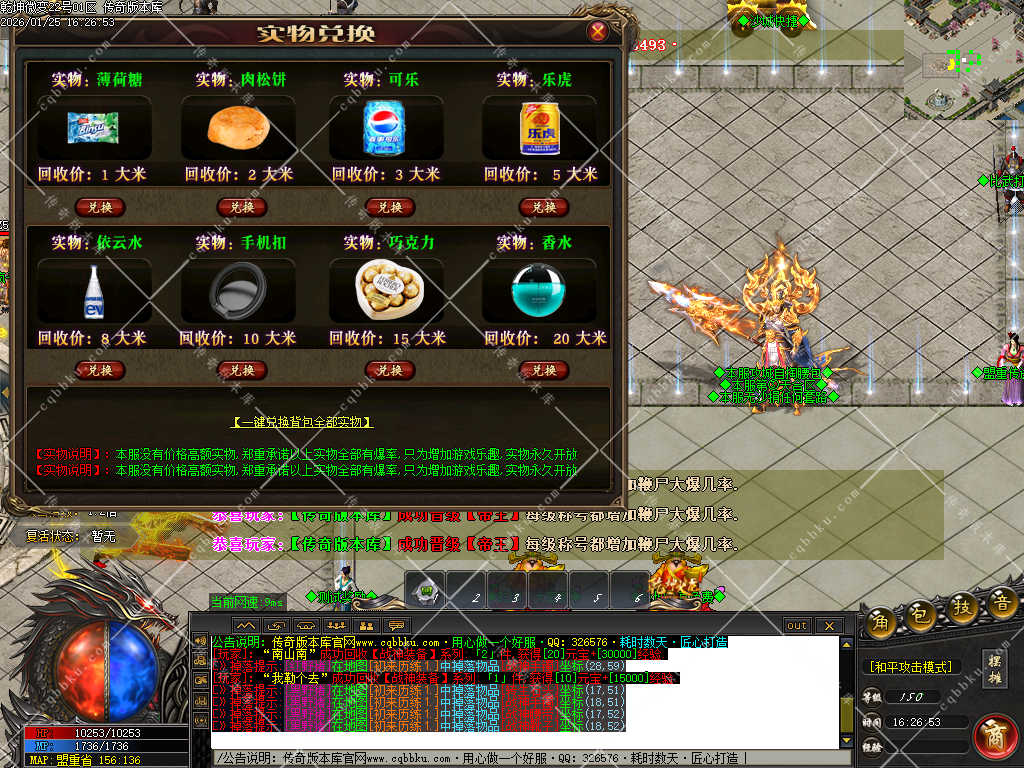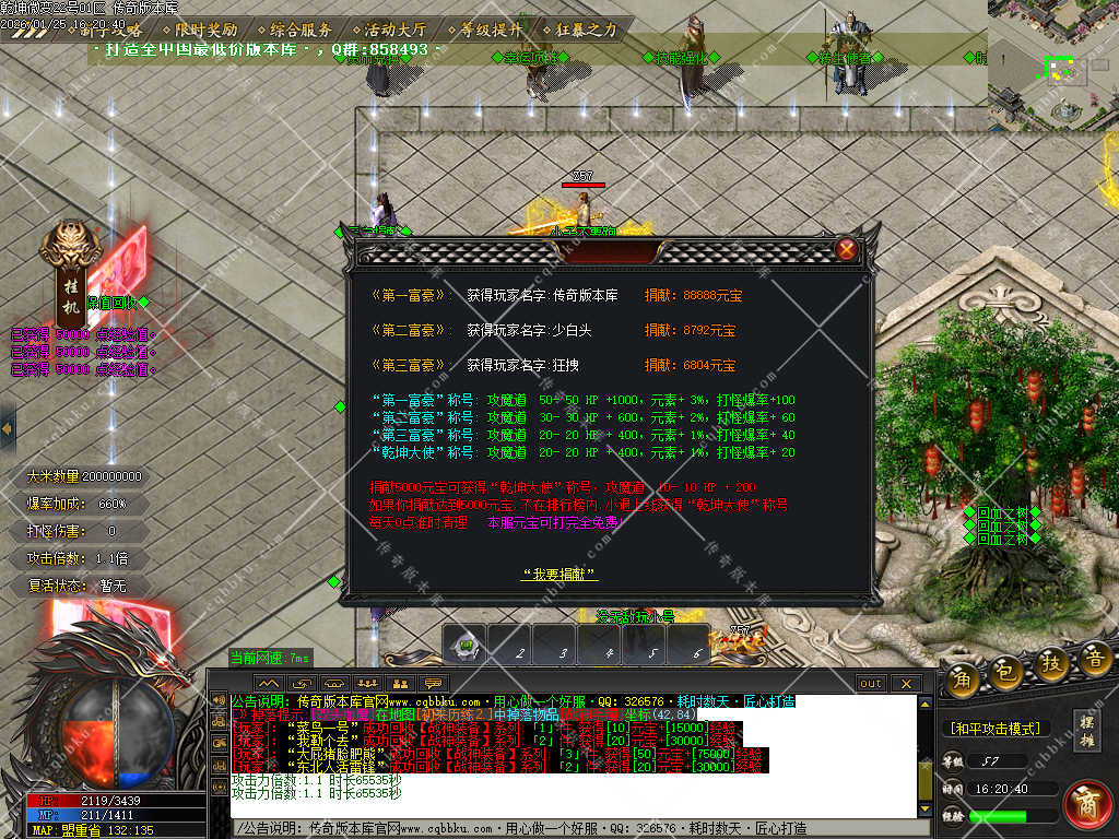 【游戏介绍】: 本服所有装备全部由怪物掉落,一个赞助玩遍全服,元宝是唯一货币.无任何一项大米消费!
